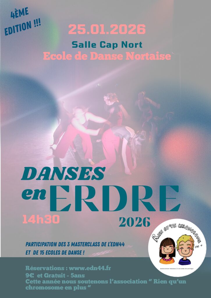 L’École de Danse Nortaise organise la quatrième édition de ses RENCONTRES CHORÉGRAPHIQUES : « Danses en Erdre » le dimanche 25 janvier 2026 à 14h30 à la salle CAP NORT. L’EDN invite des écoles de danse du département et même de la France entière afin de partager un moment convivial et de découvrir la danse et sa diversité. C’est l’occasion de découvrir le travail de nos trois MASTERCLASS. Cette année, les élèves danseront pour Ambre et sa famille, les bénéfices du spectacle seront reversés à l’association « RIEN QU’UN CHROMOSOME EN PLUS ». Attention : le nombre de places étant limité et la demande est très forte, n’attendez-pas le dernier moment pour les réserver !